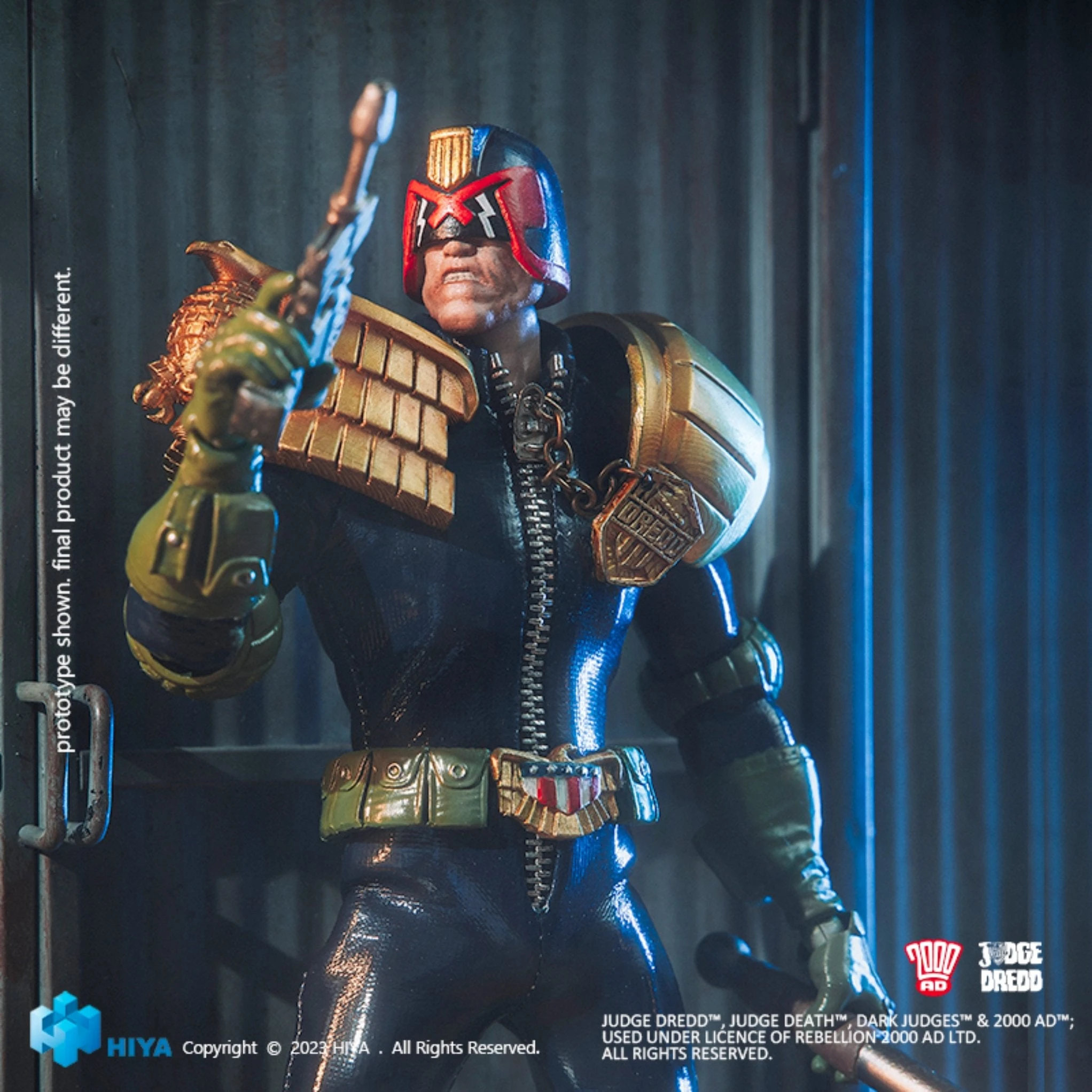 He will also come with five pairs of interchangeable hands in different poses, including loose grip, fists, daystick holders, gun holders, one pulling the collar of a recently apprehended perp, and one spraying a can of the miracle plastic Boing®.In addition, he will come with both Mark One and Mark Two type Lawgiver handguns and a can of Boing® spray, as well as fantastic gun flame effect and smoke effect pieces, a Boing® spray can special effect piece, a nine-hole base, a storage base, and a three-section bracket for posing.