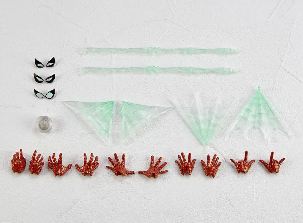 The spiderweb effect parts have also been renewed, bringing us a straight web fired like a bullet, a fan-shaped web for netting bad guys, and a wing-shaped part that stretches between his arms and body so Spidey can glide! Interchangeable hands are also included to allow for uniquely expressive action. His eyes are replaceable, with three sets included for different expressions; you can even combine different eyes on the left and right! A base with a built-in magnet is also included. Order this amazing Spider-Man action figure for your own collection now!