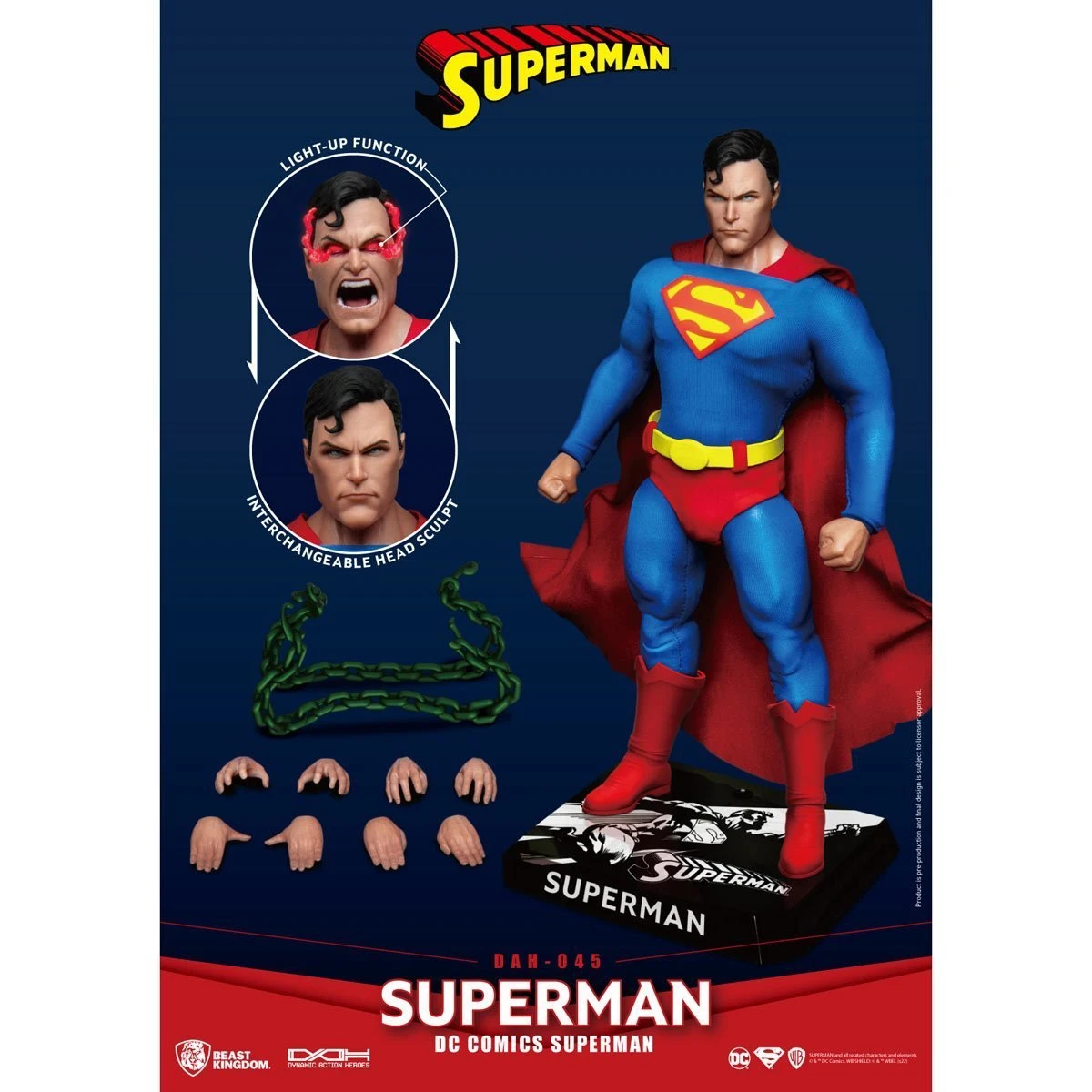 The DAH-045 DC Comics Superman brings to life this muscular, heroic and brave figure as a highly articulated collectors piece. Standing tall at 8″ in height, the figure features a real fabric costume befitting the bulletproof hero! The classic costume is matched with a pair of highly detailed head sculpts: one with a classic heroic look, and the other of Superman in ‘anger’ mode. The angry sculpt includes light-up LED’s with heat vision special effects to really showcase Superman in his most furious state! For fans of the classic superhero with his original suit, this is one set not to be missed!