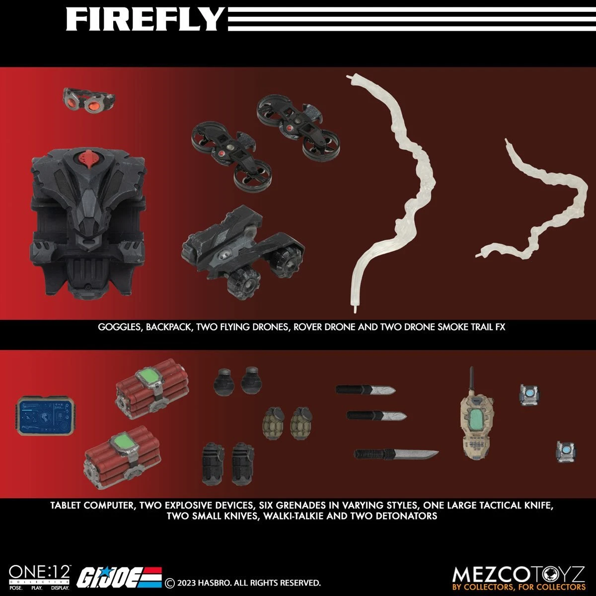 The One:12 Collective Firefly is outfitted in a Cobra-issued camo uniform with Cobra insignia, chest harness, utility belt, thigh holsters, and tactical boots. A backpack is included which is used for flying and rover drone storage and can attach to the back of his chest harness. Firefly comes complete with 3x head portraits in varying expressions.