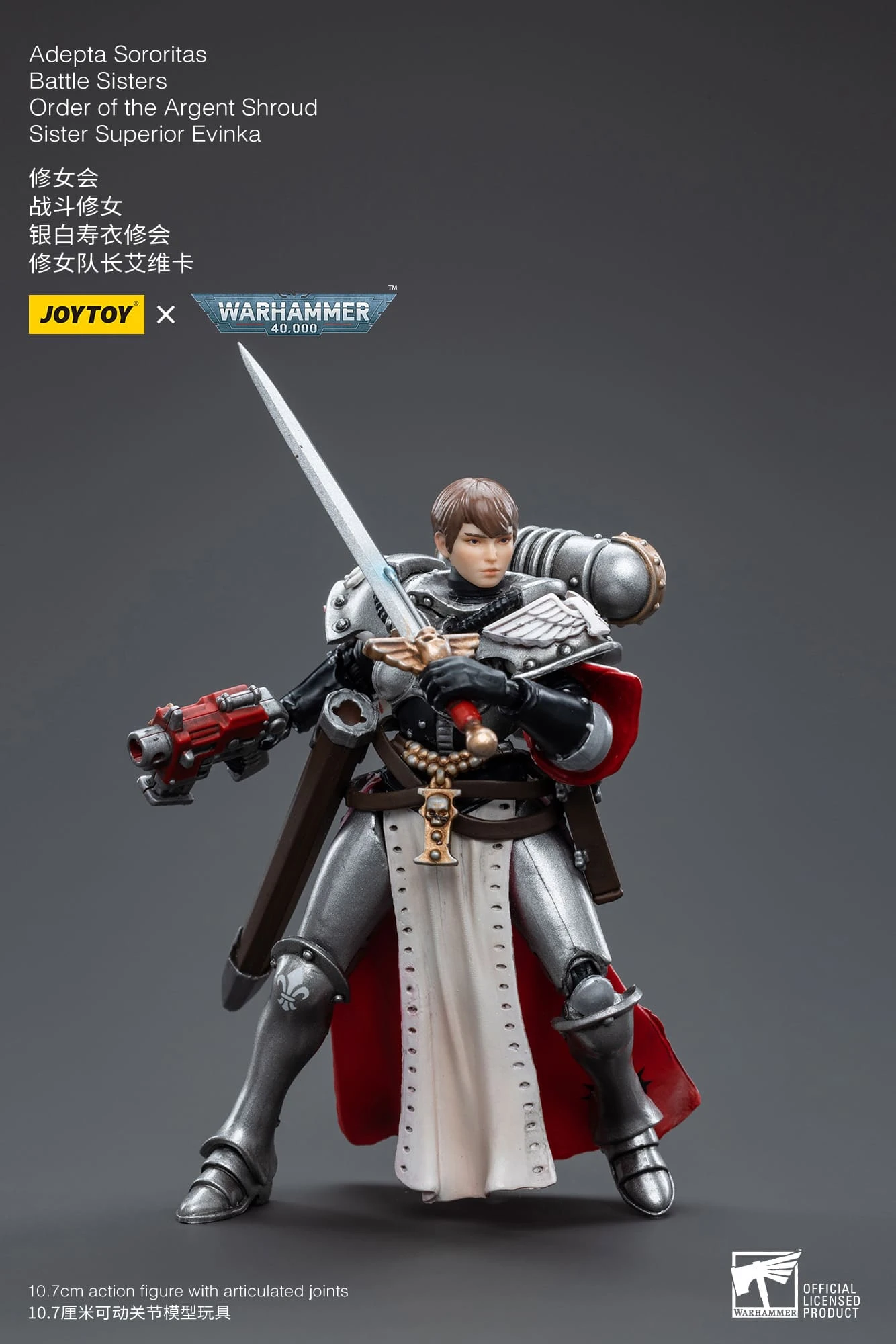 This is a 1/8 scale highly detailed, articulated figure based on Warhammer 40k’s Adepta Sororitas Battle Sisters Order of the Argent Shroud. Sister Superior Evinka’s figure stands just over 4 inches tall and comes with several interchangeable parts and accessories, opening the door to a plethora of different and unique display opportunities.