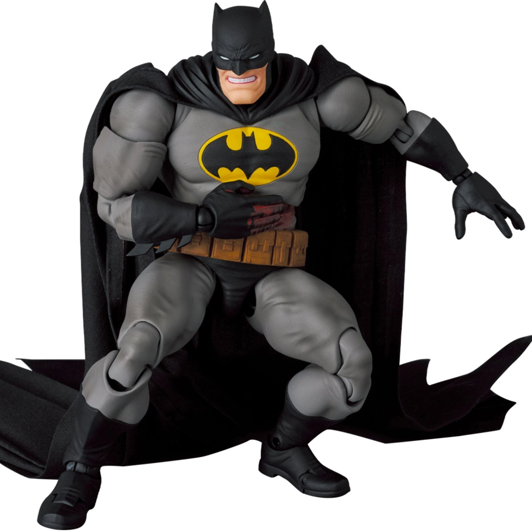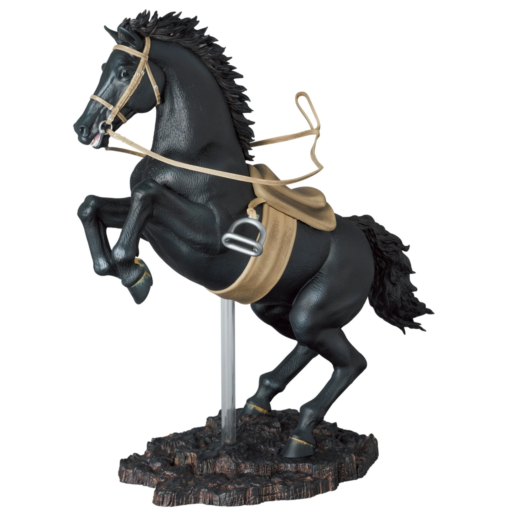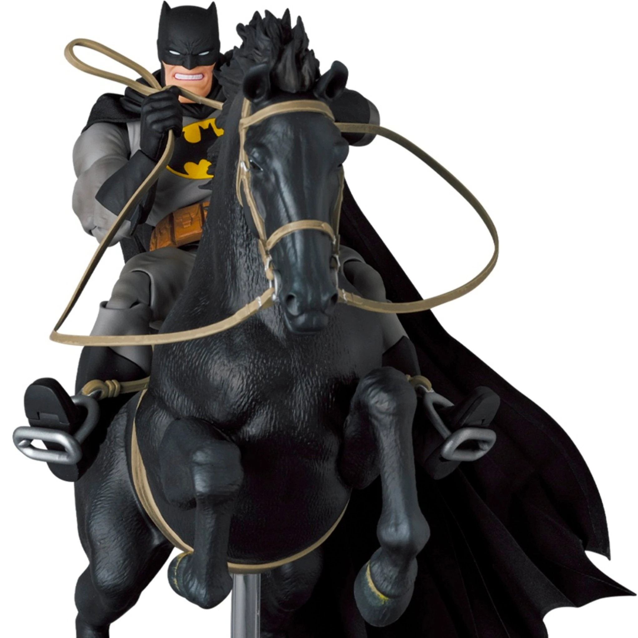 From the pages of the Dark Knight Returns comes a MAFEX figure set featuring Batman and his trusty horse from the comics. Batman and his horse feature premium detail and articulation and include several accessories for a wide variety of display options. The horse is not articulated, is set in a rearing stance, and is attached to its base.