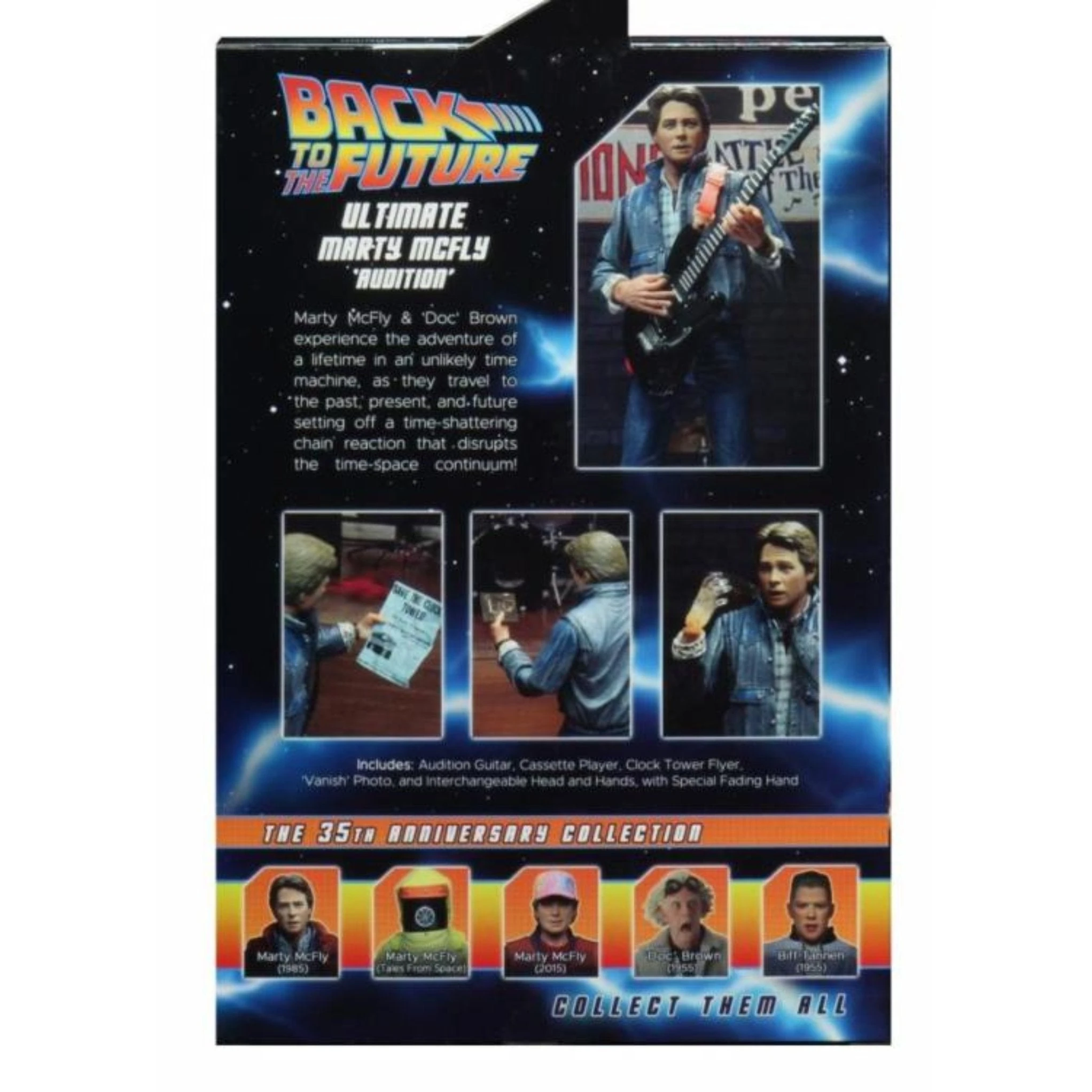 - Includes Marty Figure, 2 Head sculpts, Fading hand, Clock tower flyer, Guitar playing hands, Guitar, Walkman with headphones, & Family photo