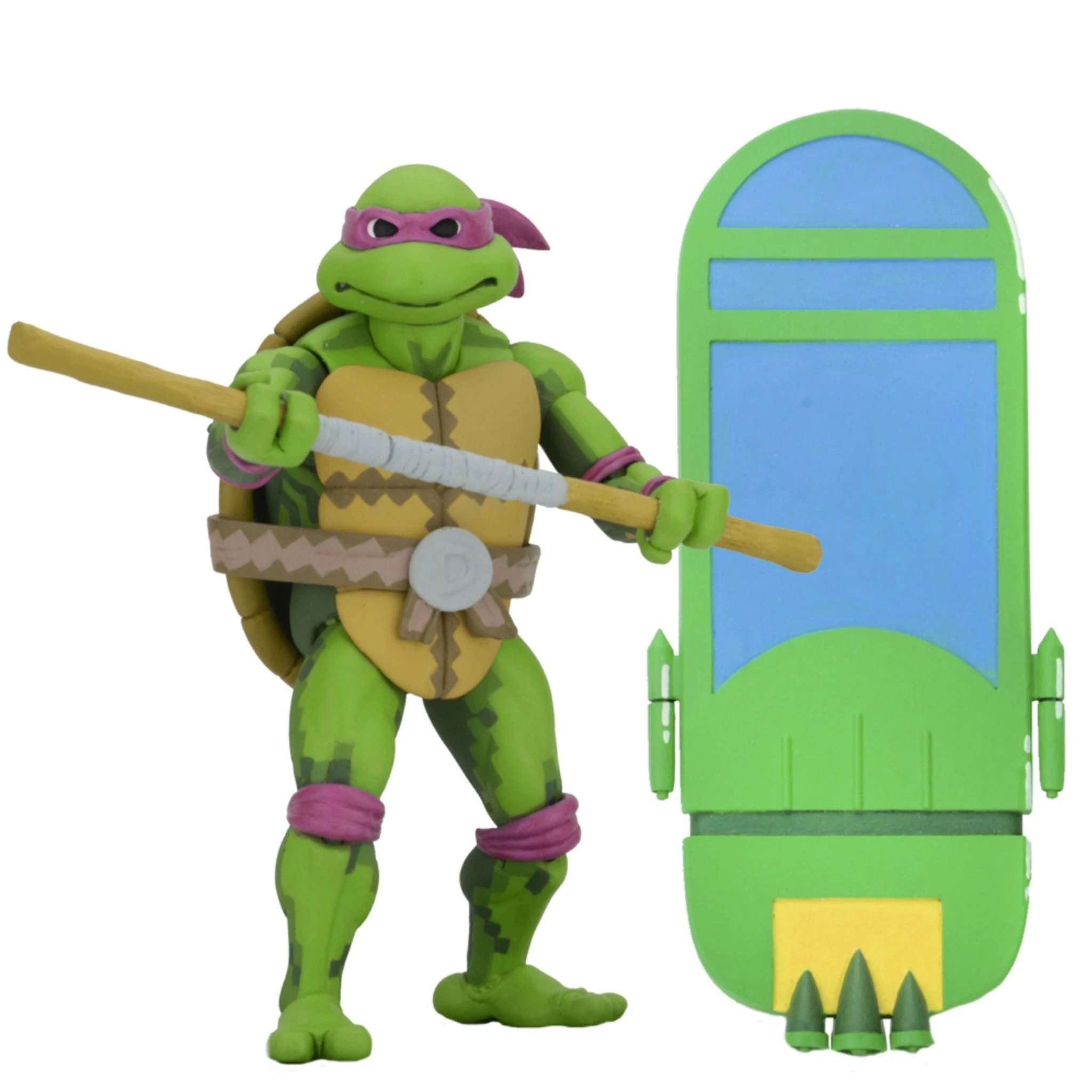 From the classic 1990s Turtles in Time video game, weโre excited to offer a new line-up of 7โ scale action figures. Series 1 includes Donatello, Leonardo, Slash, and a Foot Soldier. Donatello, Leonardo and Foot Soldier come with signature weapons and a brand new hoverboard with display stand that can be used for even more poses. The evil mutant turtle Slash comes with sword accessory.