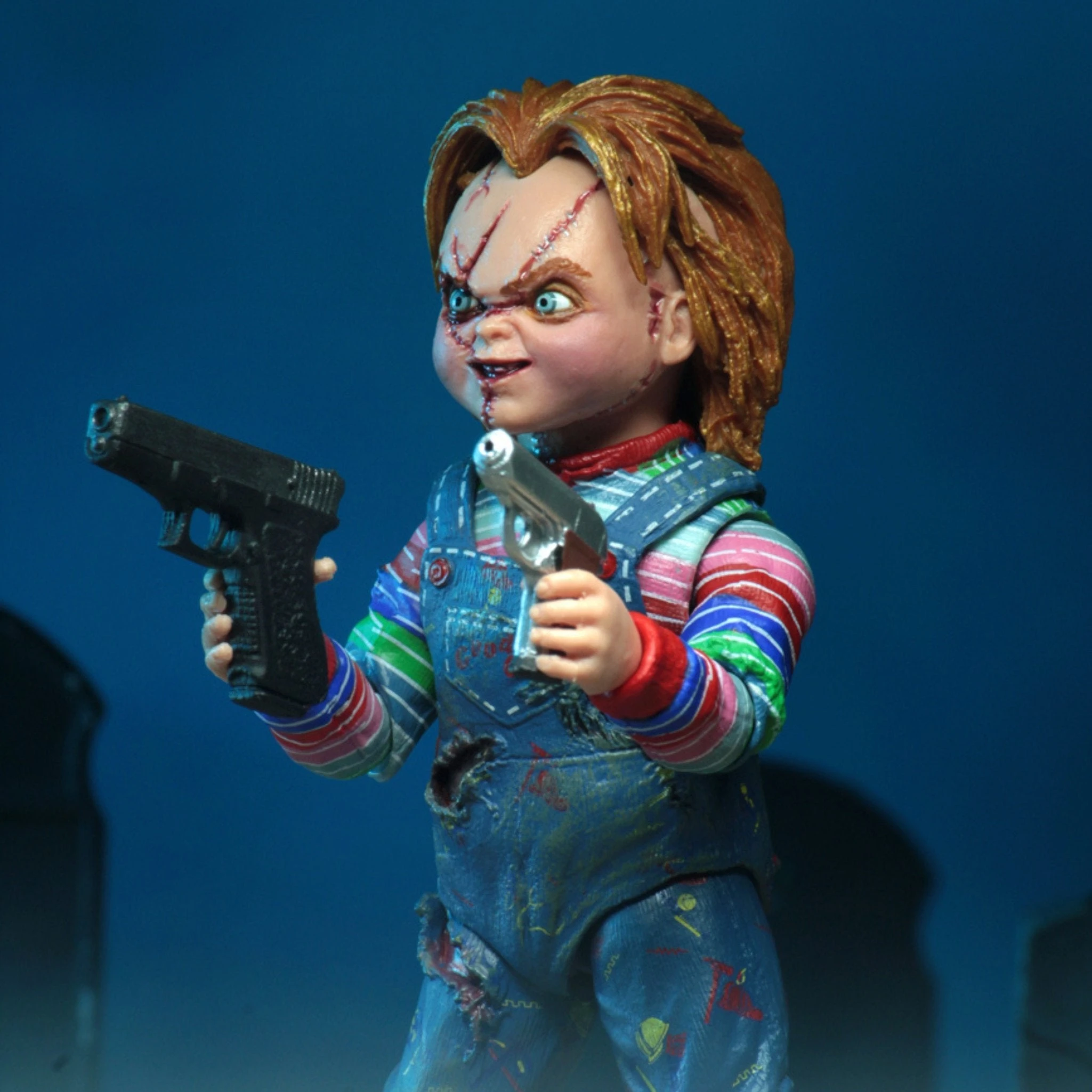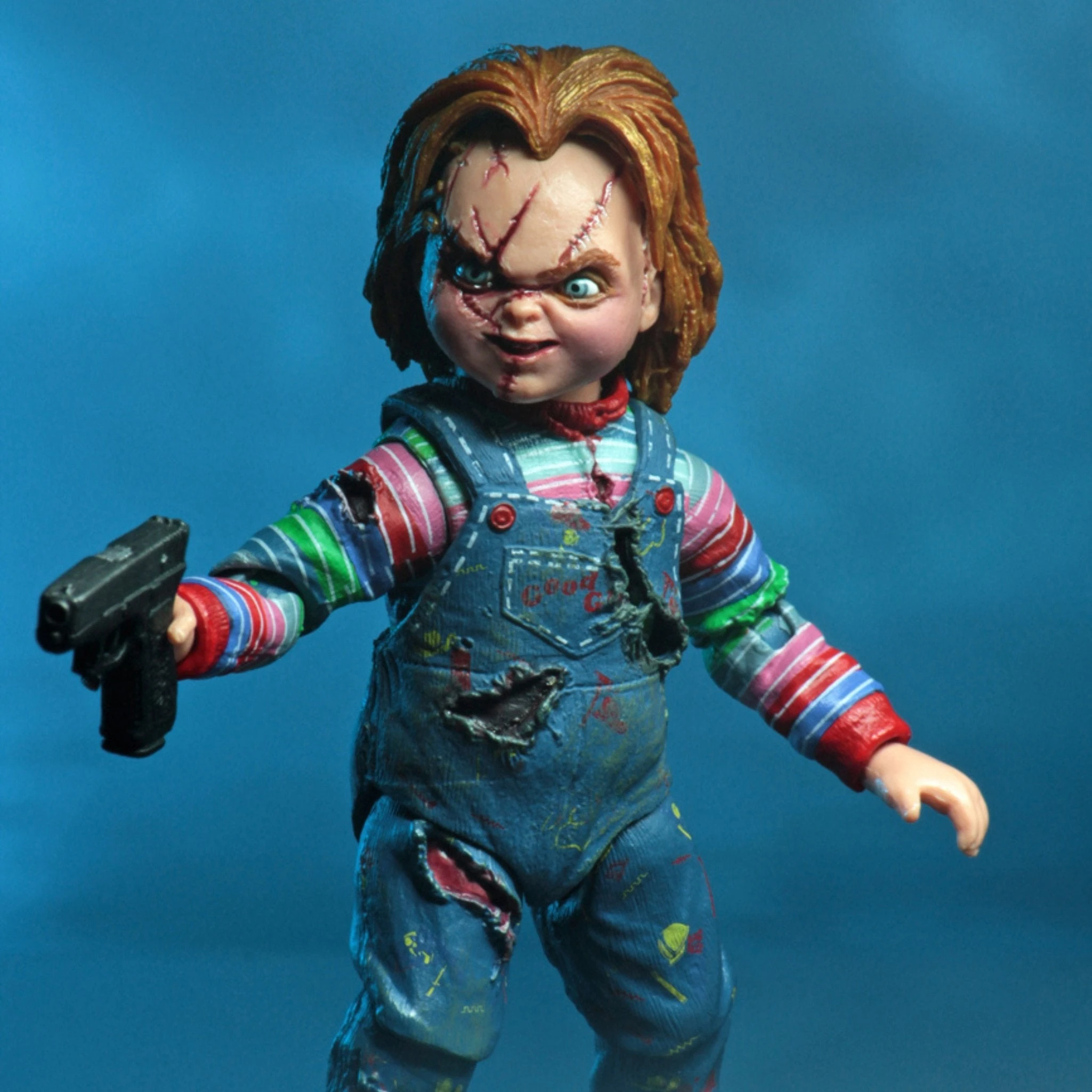 This Ultimate action figure 2-pack includes Chucky and Tiffany, who features a fabric skirt and an extra set of removable arms so she can wear her iconic leather jacket. The set also includes tons of accessories to recreate the movie’s best scenes: 6 interchangeable heads, 2 shovels, 2 pistols, 2 knives, bottle, baster, necklace and more! The figures stand 4″ tall and have over 20 points of articulation.